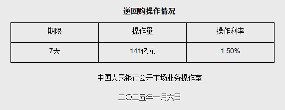 2025年1月6日,中国人民银行通过固定利率及数量招标方式,开展了141亿元7天期逆回购操作,操作利率为1.50%,旨在保持银行体系流动性充裕。