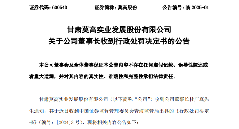 莫高股份董事长杜广真因内幕交易自家公司股票被罚近170万元,公司并购重组计划告吹,面临退市风险警示,经营压力增大。