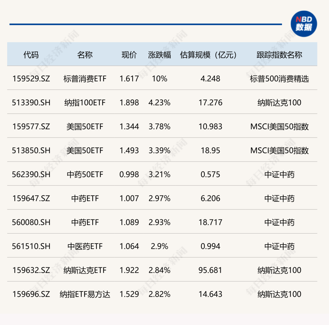 在ETF涨跌幅方面,标普消费ETF表现尤为突出,强势涨停,而纳指100ETF也大幅上涨超过4%,显示出市场对其的强烈看好。同时,伴随美股上周五的收盘走高,科技股成为领涨的主力军,纳指与标普500指数均成功终结了此前连续五个交易日的下跌颓势。