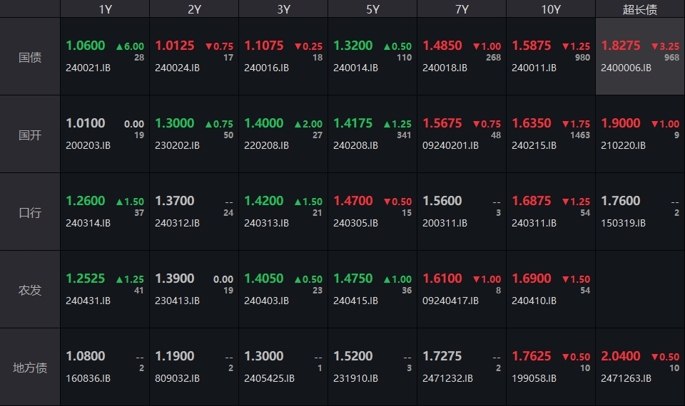 银行间市场回购定盘利率和回购利率也普遍下行,显示市场流动性充裕。一级市场方面,今日交易所市场非金信用债涨幅排行前五的债券分别为H1碧地03、H1融创01、H9龙控01、23深投04和24铁建K1。存单方面,今日3M期国股在1.55%-1.61%位置需求较好,较前一日上行0.5bp;1Y期国股报在1.535%-1.57%的位置,较前一日下行0.5bp。AAA级存单方面,9M成交在1.59%,1Y成交在1.57%的位置。
