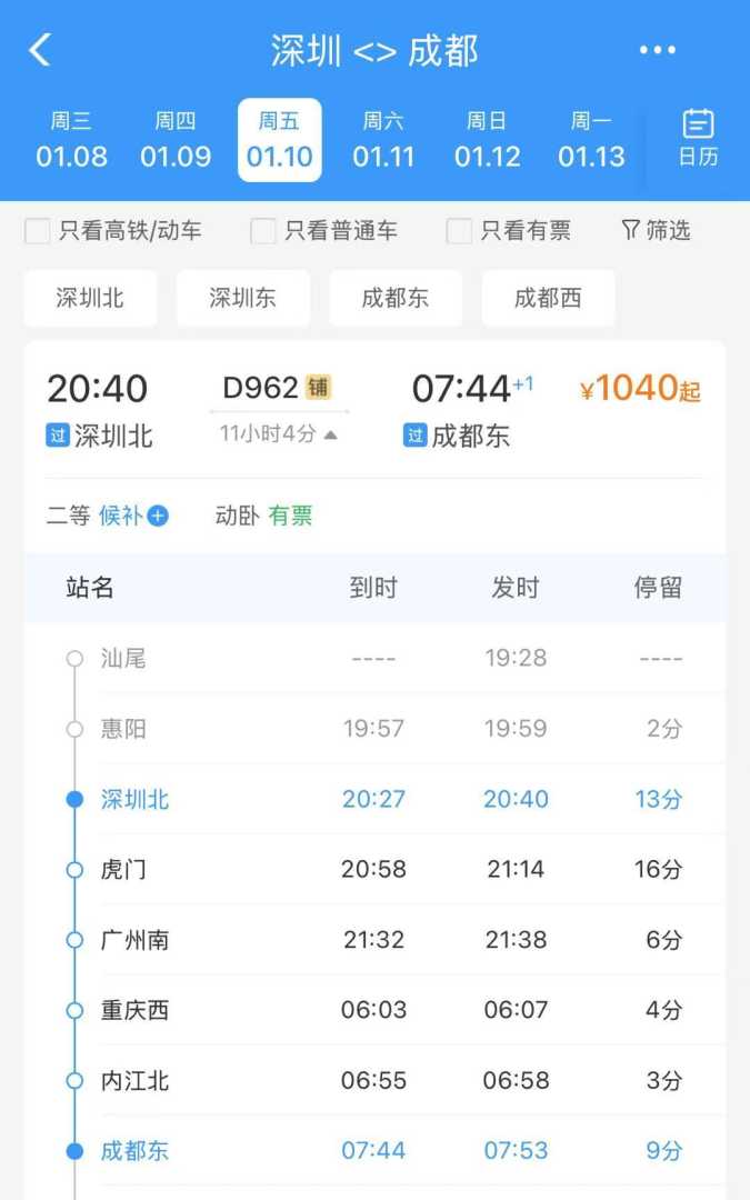 早在2024年国庆期间,为满足两地市民的出行需求,铁路部门就已结合12306候补订单大数据分析,以临客方式加开了深圳往返成都的动卧列车。经过前期“试水”,自1月5日起,两地之间的动卧列车实现常态化开行。列车采取逢周末开行策略,沿途经过广州、深圳、重庆、成都等重点城市,中间不再停车一站直达重庆,大大缩短了整体运行时间。从深圳乘坐动卧到成都全程耗时11小时4分钟,票价相对合理,为旅客提供了便捷、舒适的出行体验。