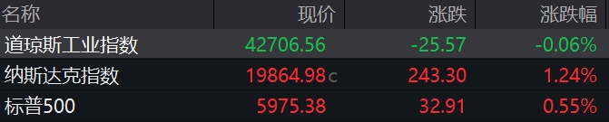 当地时间周一,美股市场呈现出分化态势,其中纳指上涨1.24%,标普500指数微涨0.55%,而道指则略微下跌0.06%。