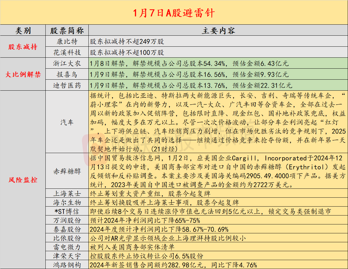 导读:财联社1月7日发布投资避雷针报告,详细梳理了A股及海外市场潜在风险事件。国内经济方面,超30家汽车品牌新年集体降价,打响2025年“价格战”;同时,美国对进口自中国的赤藓糖醇发起双反调查。公司预警方面,海尔生物终止筹划换股吸并上海莱士事项,股票复牌;*ST博信面临交易类强制退市风险。海外市场,美股三大指数涨跌互现,纳斯达克中国金龙指数收跌;特朗普否认关税政策将缩水报道。
