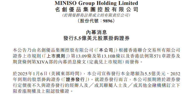 1月7日,名创优品发布公告称,公司将发行本金总额为5.5亿美元、2032年到期的股票挂钩证券。该证券的初始行权价为64.4港元/股,较公告前一交易日的港股价格溢价26.1%。尽管这份“看涨期权”保护了现有投资者的利益,但消息公布后,名创优品的美股价格下跌12.66%,港股也下跌5.19%。
