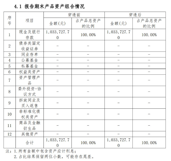 值得注意的是,渝农商理财的“兴时(最短持有1个月)每日开放1号”是一款中低风险的公募固收类产品,成立于2021年12月29日。该产品设置了从A到I共9个份额,面向不同的销售渠道,业绩比较基准为2.2%~3.8%。本次上榜的是其H份额,该份额面向中邮邮惠万家银行销售,资产规模较小,仅为84.65万元。因此,其资产配置更为灵活,更容易取得优异的业绩。从母产品持仓情况来看,穿透后持有比例最高的是现金及银行存款,占比42.42%,其次是债券占比33.40%、同业存单占比11.55%、公募基金占比9.95%、拆放同业和债券买入返售占比2.55%,权益类投资占比仅为0.13%。