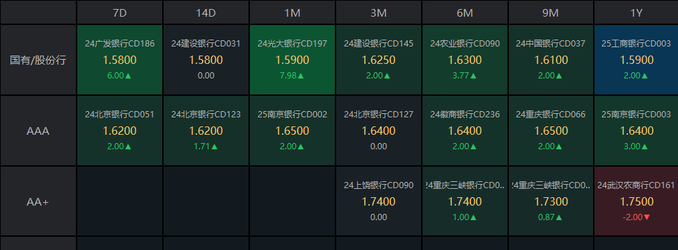 银行间主要利率债收益率亦呈现全面上行态势。截至下午16:30,10年期国债活跃券240011收益率上行3.25bp至1.6325%,30年期国债活跃券2400006收益率上行2.8bp至1.893%,10年期国开活跃券240215收益率上行2.75bp至1.6725%。
