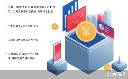 此次发行的第一期中央银行票据期限为6个月(182天),采用固定利率附息债券形式,到期还本付息,发行规模为人民币600亿元。票据的起息日为2025年1月17日,到期日为2025年7月18日,如遇节假日则顺延。