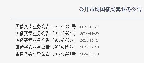 根据中国人民银行官网“公开市场国债买卖业务公告”页面显示的数据,截至2024年12月31日,该行已发布了5期国债买卖业务公告,显示其在2024年8月至12月期间,通过公开市场操作净买入的债券面值分别为1000亿元、2000亿元、2000亿元、2000亿元和3000亿元。