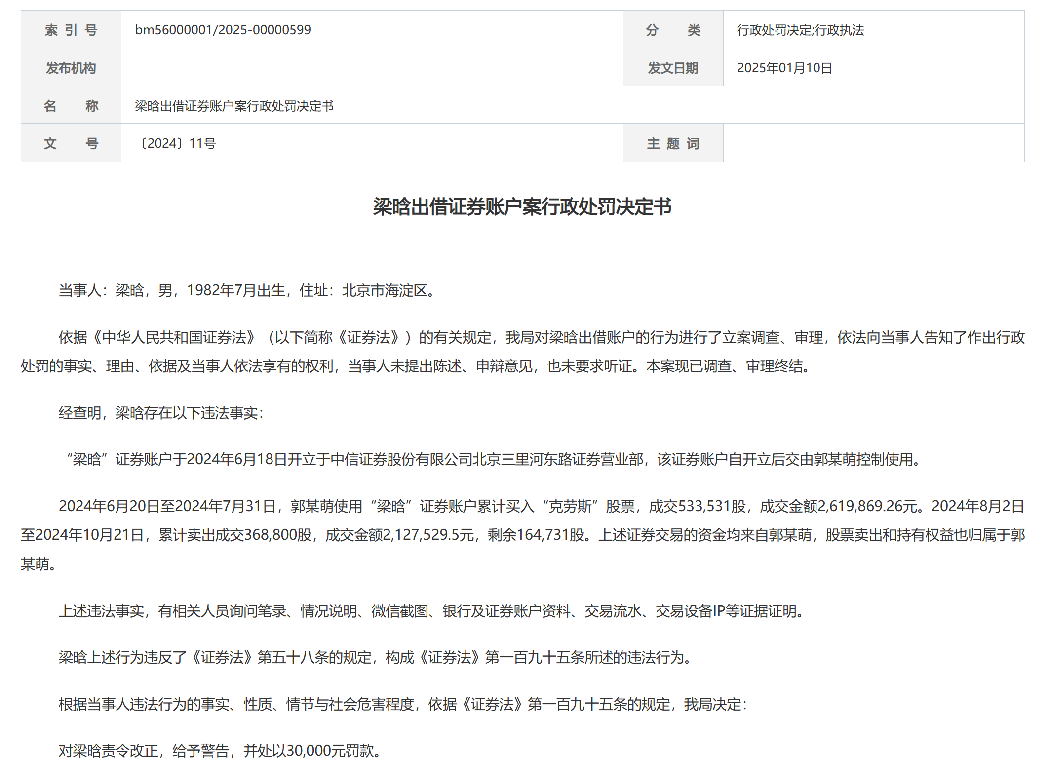 财联社1月10日讯(记者王晨)1月10日,山西证监局发布了一则针对个人投资者梁晗的处罚公告。梁晗因出借其证券账户给他人使用,违反了《证券法》相关规定,被责令改正并处以30,000元罚款。这一事件再次凸显了证券市场上出借或借用证券账户从事交易的违规行为的严重性。
