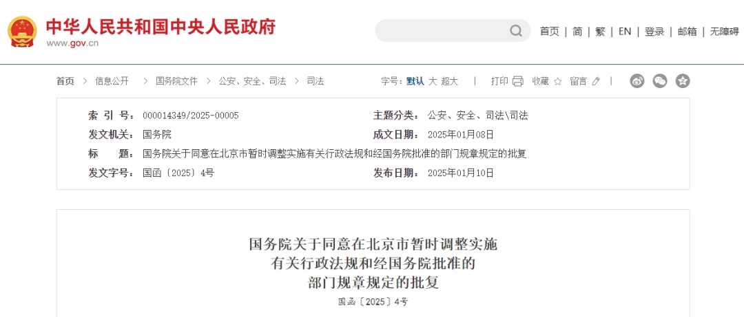 1月10日,中国政府网发布重要消息,国务院正式批复了关于在北京市暂时调整实施有关行政法规和经国务院批准的部门规章规定的请求。这一批复旨在支持北京深化国家服务业扩大开放综合示范区建设。