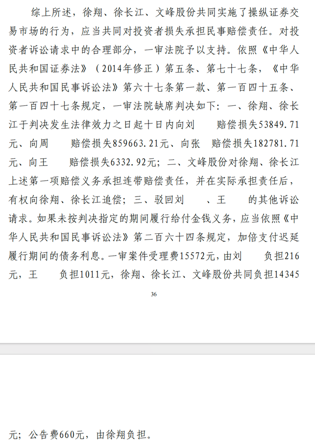 江苏省高级人民法院对该案作出了终审判决,投资者在操纵证券市场责任纠纷案中二审胜诉。判决书显示,徐长江和文峰股份曾对一审判决提起上诉,但江苏高院在经过公开开庭审理后,维持了一审判决中关于徐翔、徐长江和文峰股份共同承担投资者损失赔偿责任的部分。