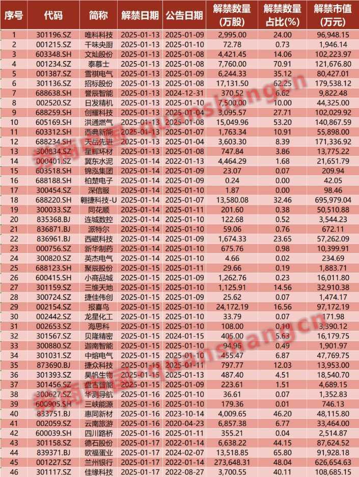 本周A股市场将有46只股票面临解禁,合计解禁市值约为321.86亿元,其中翱捷科技-U和兰州银行的解禁市值均超过60亿元。