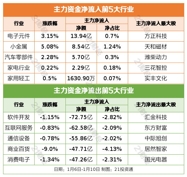 过去一周(1月6日—1月10日),A股三大指数集体收跌。截至1月10日收盘,上证指数报3168.52点,周跌1.34%;深成指报9795.94点,周跌1.02%;创业板指报1975.30点,周跌2.02%。个股表现方面,约34%的个股周内上涨,109股周涨幅超过15%,而64股周跌幅超过15%。按申万一级行业分类,综合、家用电器、有色金属、电子等板块涨幅居前,而服务、食品饮料、煤炭和商贸零售等行业跌幅居前。