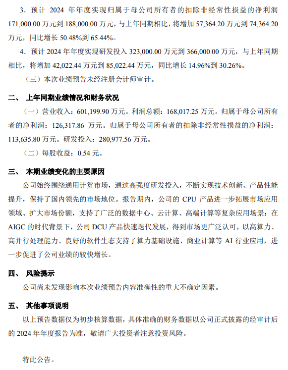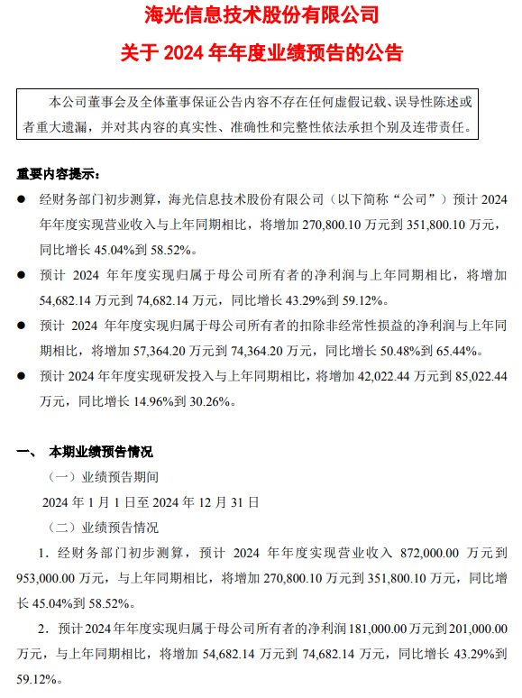 海光信息发布晚间公告,预计2024年全年营业收入将大幅增长,归属于母公司所有者的净利润和扣除非经常性损益后的净利润均实现显著增长,研发投入也有所增加。