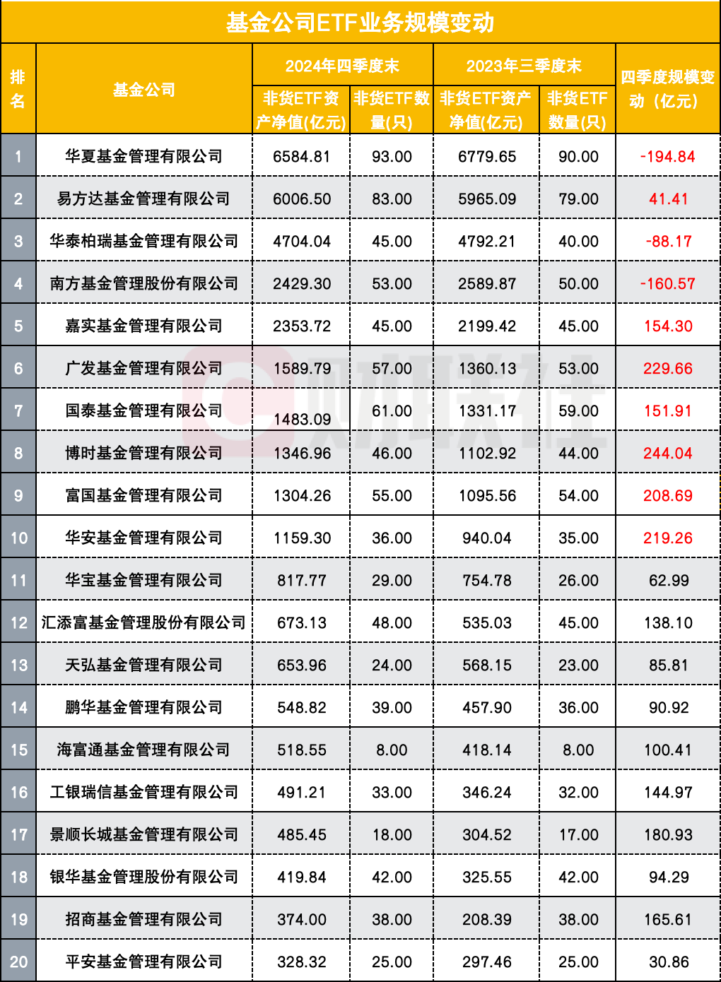 2024年四季度,部分头部基金公司因非货ETF业务规模的增长,使得其非货管理规模也相应增长。然而,也有数家头部公募因该业务规模阶段性出现小幅缩水,导致整体规模下滑。数据显示,博时、广发、富国、景顺长城、招商基金、嘉实基金、国泰基金、工银瑞信、汇添富、海富通等逾10家基金公司的非货ETF管理规模在四季度增长过百亿元。