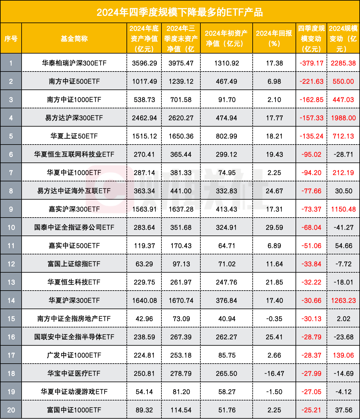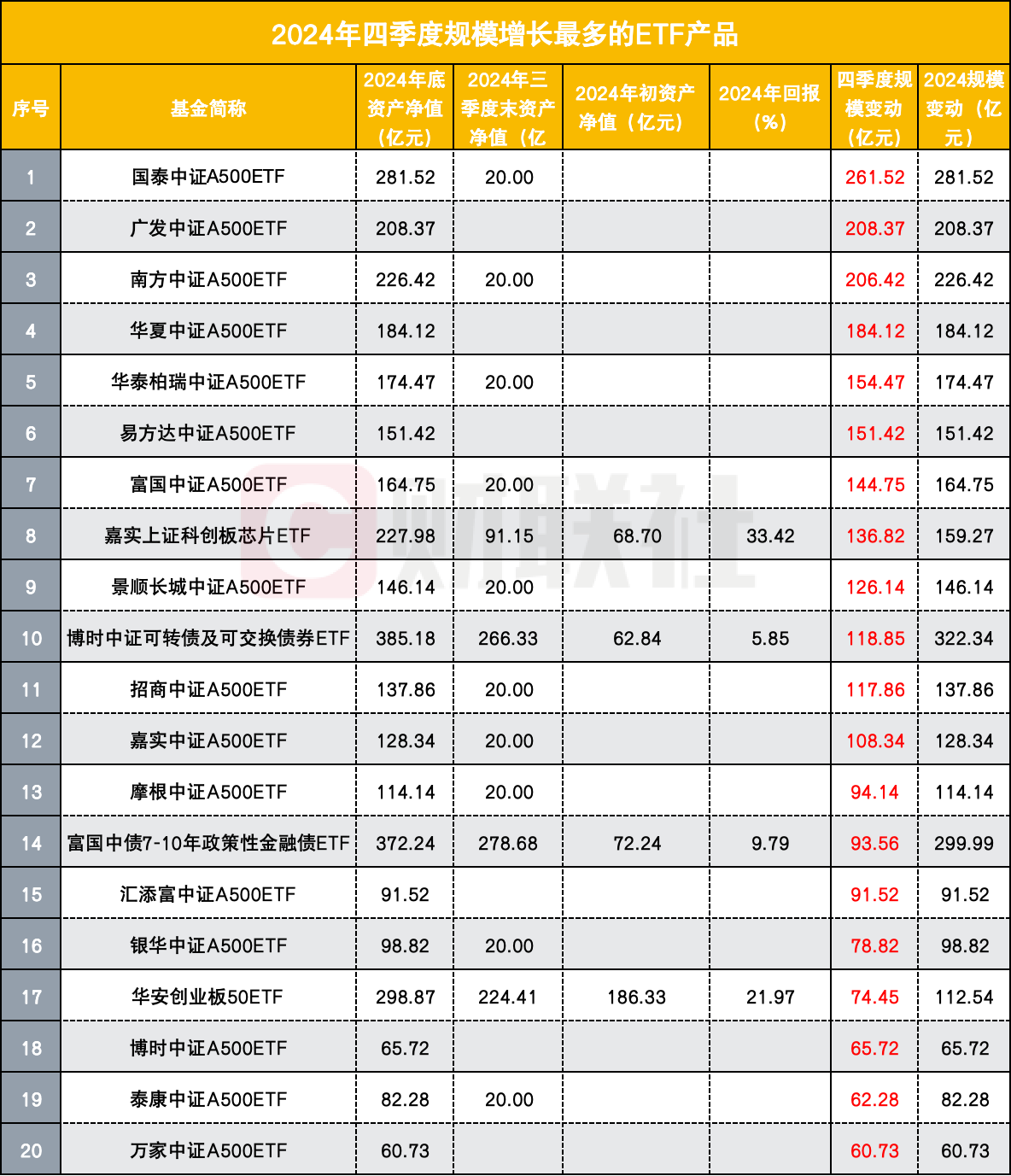 宽基ETF之间的腾挪对基金公司规模的影响显著。以华泰柏瑞沪深300ETF为例,该产品虽然在2024年规模增长了2285.38亿元,但在四季度却缩水了379.17亿元。同样,南方中证500ETF和南方中证1000ETF两只产品在2024年规模增长近千亿元,但四季度分别缩水221.63亿元和162.85亿元。与此同时,新成立的中证A500ETF在四季度却吸引了近2400亿元的资金,其中12只规模已过百亿元。