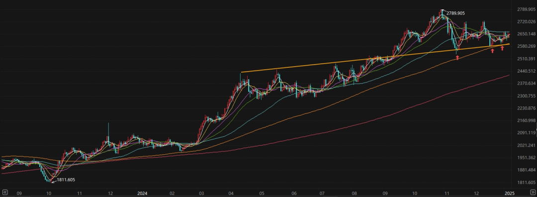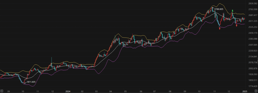 从技术面来看,2025年市场的不确定性仍然是不变的主题。从伦敦金技术分析的角度来看,2024年黄金牛市的起点是2月14日,金价在120日均线处得到强有力支撑并开启上涨序幕。目前金价维持在120日均线上方,短期内大概率在该区域上方震荡。同时,布林带逐步走窄,金价也处于布林带中线附近,市场处于横盘窄幅震荡状态,预计这一过程在2025年年初还会持续一段时间。