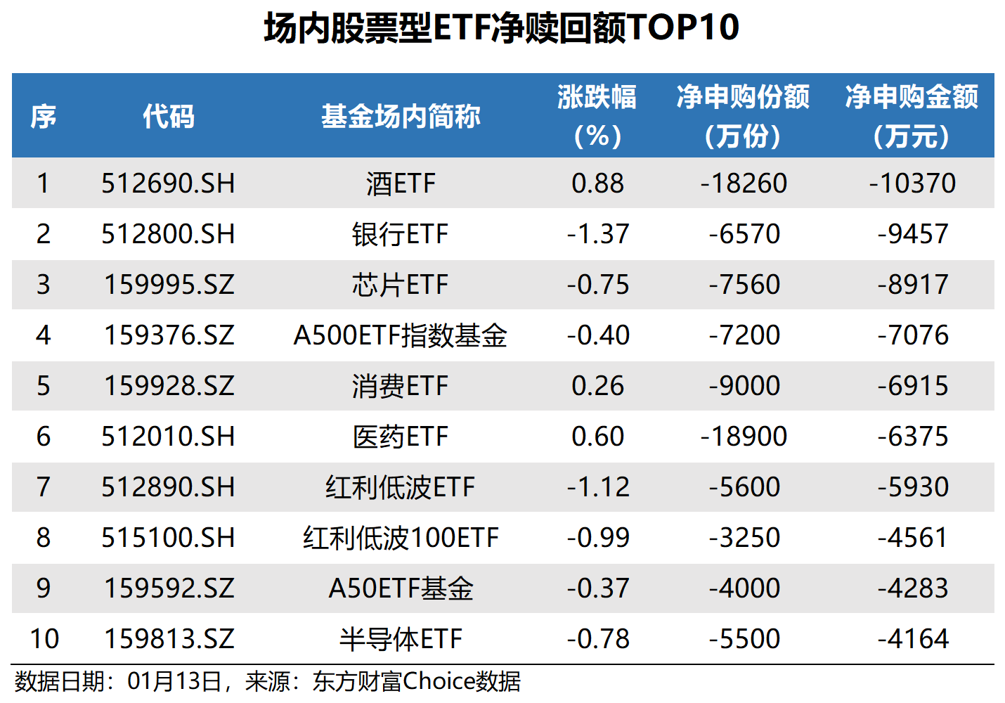 然而,并非所有ETF都迎来了申购热潮。数据显示,昨日净赎回金额最多的场内股票型ETF为酒ETF,赎回金额高达1.04亿元;而银行ETF也遭遇了不小的赎回压力,赎回金额为0.95亿元。