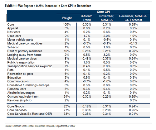 高盛与市场普遍预期观点基本一致,预计12月核心CPI将环比上涨0.25%,同比上涨3.27%。该行还预计12月总体CPI将环比上涨0.40%,反映出食品价格上涨0.35%,能源价格上涨2.3%。高盛强调了二手车、机票价格、车险等关键组成部分层面的趋势,并预计住房类别的价格将略有反弹。