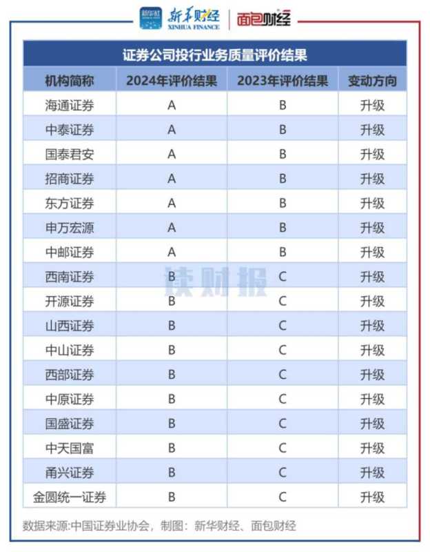 在2024年度的考评中,海通证券、招商证券、国泰君安等17家券商的投行业务执业质量评价得到了中证协的升级认可。其中,海通证券、中泰证券、国泰君安、招商证券、东方证券、申万宏源和中邮证券由B类升至A类,显示出显著的进步。而西南证券、开源证券等10家券商则由C类升至B类。