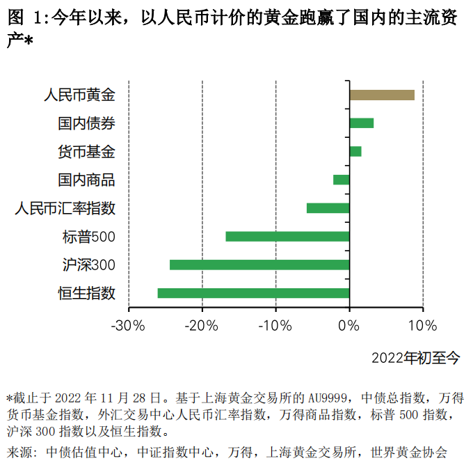 今年以来,受欧美地区经济衰退、公共卫生事件以及地缘政治等多重因素的交织影响,市场不确定性风险显著加剧,全球主要风险资产均遭受了不同程度的冲击。在此背景下,国内主流资产同样未能幸免,表现不尽如人意。然而,令人瞩目的是,以人民币计价的黄金价格却逆势上扬,年内涨幅达到了9%,成功超越了国内债券、货币基金以及国内商品等主流资产的表现。