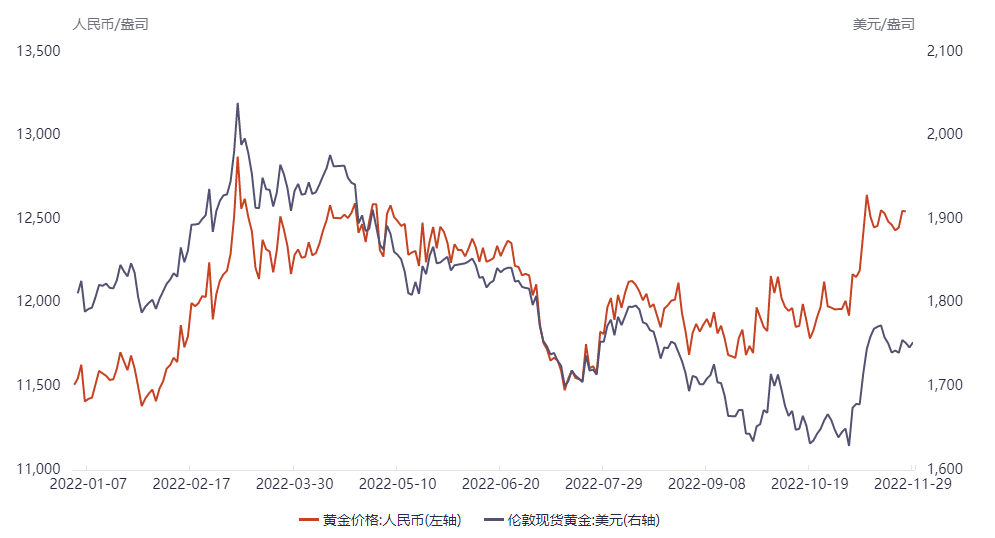 图片说明:以人民币计价黄金和以美元计价黄金对比
