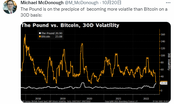 令人惊讶的是,当前美债和英镑的波动率已经与比特币不相上下。英镑,这一拥有千年历史的货币,近期因英国首相特拉斯的迷你预算案引发的市场动荡,其30天历史波动率几乎追平了以高波动性著称的比特币。