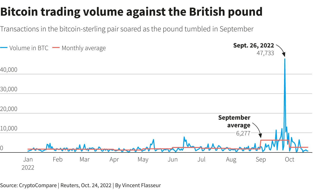 9月23日,在特拉斯发布迷你预算案后,恐慌情绪笼罩下的英国投资者开始逃离英镑,转向加密货币。CryptoCompare的数据显示,9月份比特币与英镑之间的交易量较上月增长了233%,与同样受到重创的欧元之间的交易量也增长了68%。