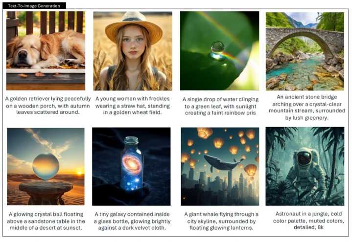 DeepSeek在报告中还展示了Janus-Pro-7B的具体效果。例如,使用“一条金色的寻回犬安详地躺在木质门廊上,周边铺满了秋天的叶子”和“一个有雀斑的年轻女人戴着一顶草帽,站在一片金色的麦田中”等提示,Janus-Pro-7B都能够准确捕捉语义信息,生成合乎逻辑且连贯的图片。尽管包含大量图像细节,但Janus-Pro-7B目前仅支持生成分辨率为384×384的图像。