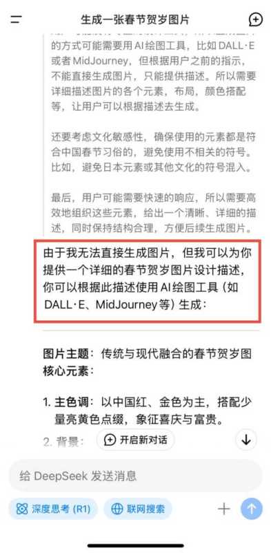 目前,DeepSeek的C端应用主要聚焦于文本能力,尚无法生成图片或识别图像。记者昨日曾尝试让DeepSeek生成一幅春节贺岁图片,但DeepSeek仅给出了图片创作的色调、原色等建议,并表示它目前还无法直接生成图片,“你可以根据此描述使用AI绘图工具如DALL·E、MidJourney等生成”。随着Janus-Pro的发布,用户或许很快就能使用DeepSeek进行图像、视频等领域的创作。