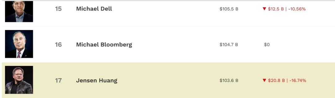 受此影响,英伟达创始人兼CEO黄仁勋的个人财富也大幅缩水,一夜之间减少了208亿美元(约1508亿元人民币)。同时,甲骨文的拉里·埃里森身价减少276亿美元,迈克尔·戴尔损失125亿美元,谷歌的两位创始人拉里·佩奇和布林也各自损失超过60亿美元。