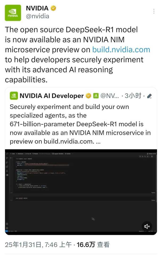 此外,英伟达也宣布DeepSeek-R1模型现已在其平台上作为NVIDIA NIM微服务预览版提供。这一消息进一步证明了DeepSeek在业界的地位和影响力。