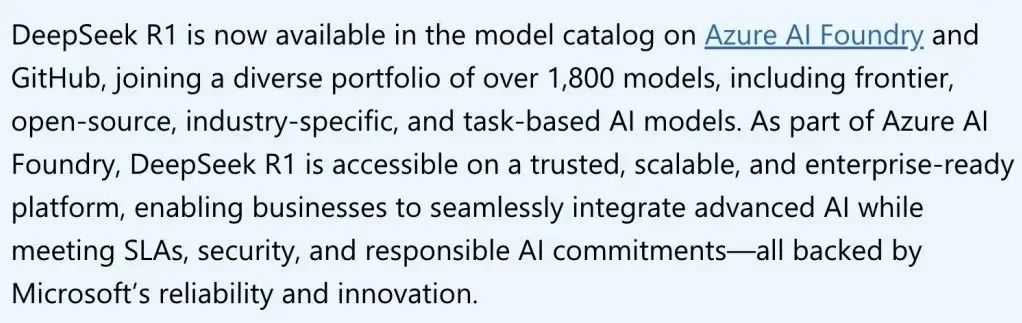 微软CEO萨提亚·纳德拉在财报电话会上表示,DeepSeek“有一些真正的创新”,并将AI成本下降视为大趋势。他透露,DeepSeek的R1模型已被纳入微软平台Azure AI Foundry和GitHub的模型目录,开发者将能够很快在Copilot +PC上本地运行DeepSeek的R1精简模型,以及在Windows上庞大的GPU生态系统中运行。纳德拉认为,DeepSeek的推出将促进AI的普及,对微软等超大企业和PC平台提供商而言是好消息。