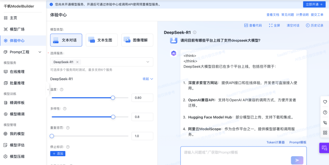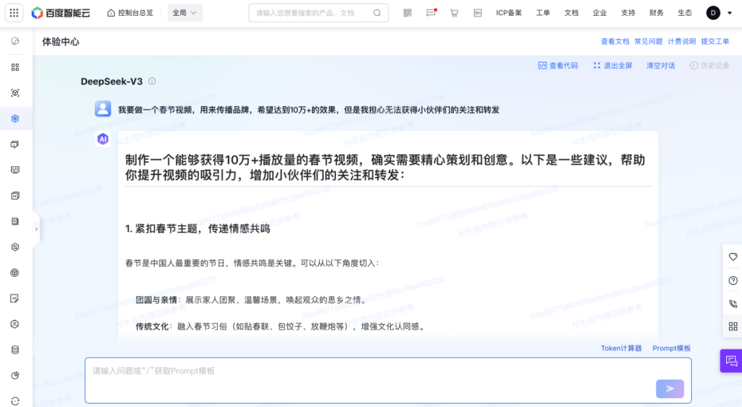 据悉,该模型限时免费服务将持续至2月18日24:00,限免配额包括1000RPM和10000TPM,调用Tokens无上限。基金君通过实名认证后,在百度智能云网站的“模型广场”成功调用了DeepSeek-R1和DeepSeek-V3模型,并体验了其“文本对话”功能,操作简便且效果显著。