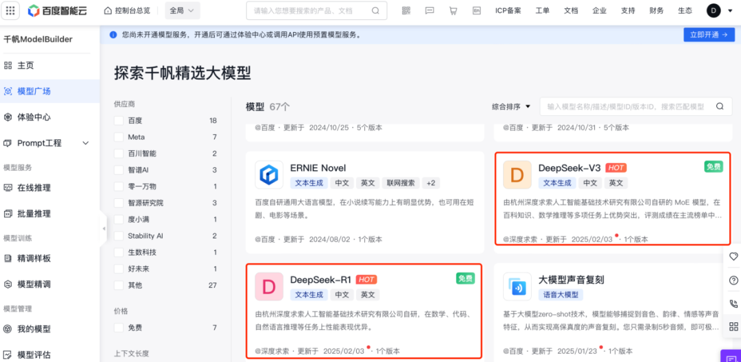 2月3日晚间,百度智能云率先行动,宣布其千帆平台已正式上架DeepSeek-R1和DeepSeek-V3模型。此次推出的超低价格方案及限时免费服务,吸引了大量用户的关注。用户只需登录百度智能云千帆ModelBuilder,即可快速体验这一前沿技术。同时,百度智能云强调,此次接入的模型已全面融合千帆推理链路,集成百度独家内容安全算子,确保模型的安全性与企业级高可用保障。