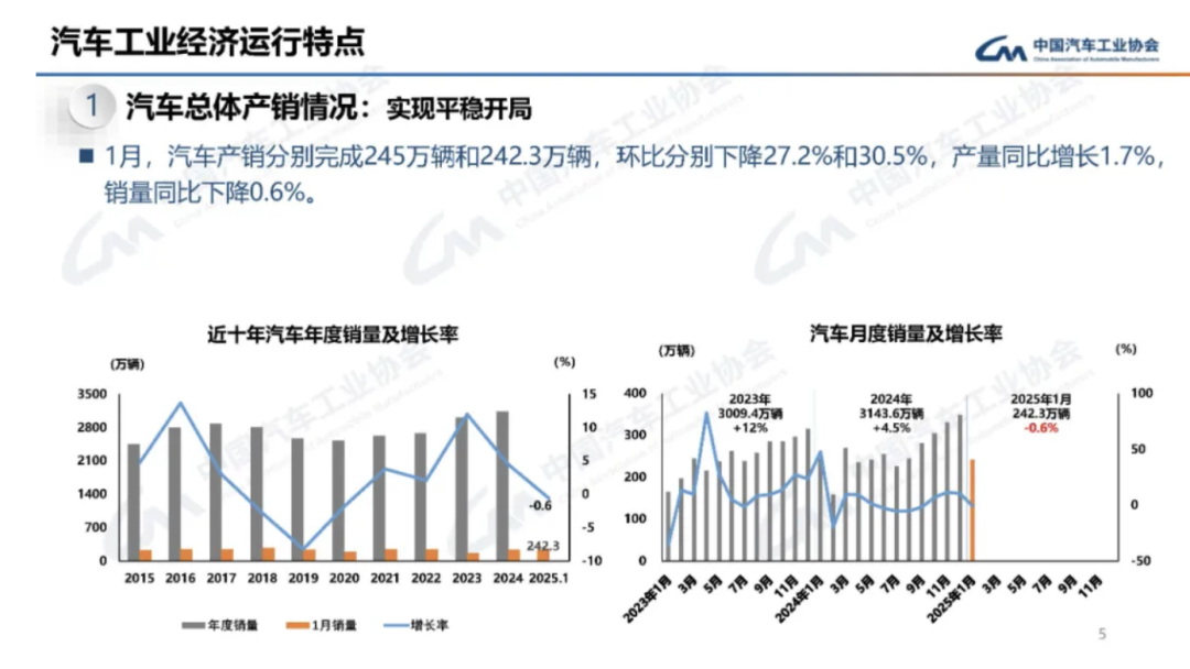 据中国汽车工业协会数据,1月,汽车产销分别完成245万辆和242.3万辆,环比分别下降27.2%和30.5%,产量同比增长1.7%,销量同比下降0.6%。这一数据反映了国内汽车市场的最新动态。