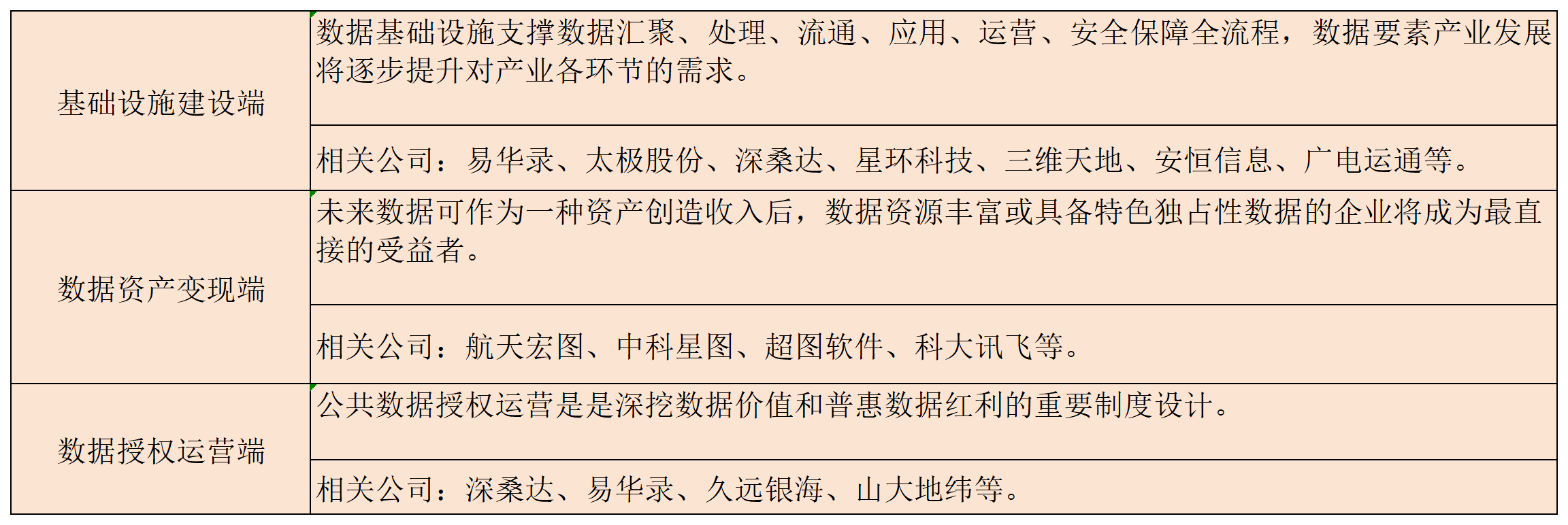 东兴证券分析称,我国数据要素顶层设计日益完善,产业端成果频出,但仍处于发展初期。短期内,数据基础设施建设方将迎来重大发展机遇;中长期来看,随着市场逐步成熟,数据资源方及具备公共数据运营授权的企业将更为受益。因此,东兴证券推荐关注基础设施建设、数据资产变现以及数据授权运营这三大主线。