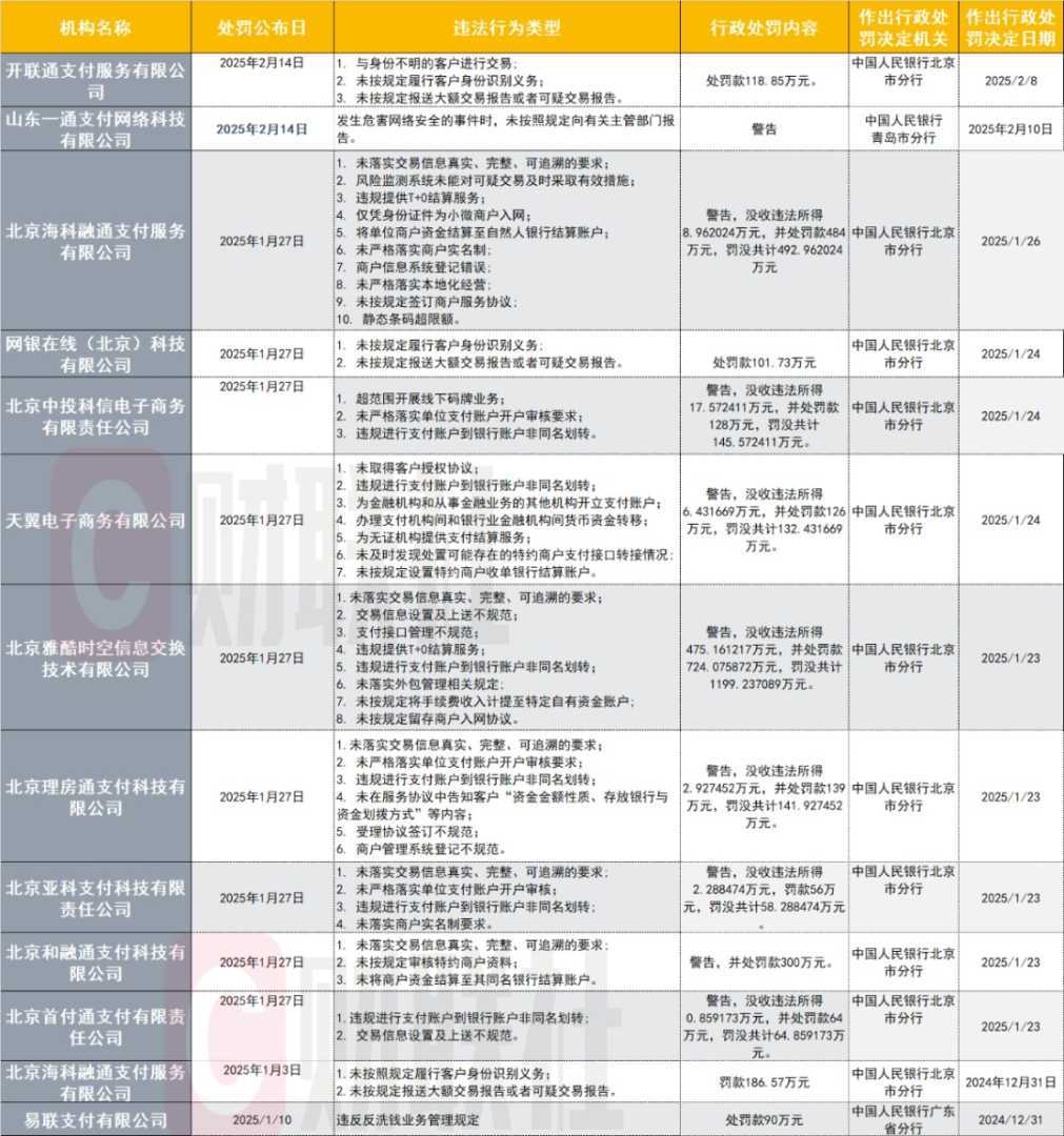 财联社2月19日讯(记者高萍)新《反洗钱法》实施后,金融业的违规被罚案例备受瞩目。据财联社记者不完全统计,2025年初以来,已有12家支付机构因违规被罚,其中反洗钱违规尤为突出。