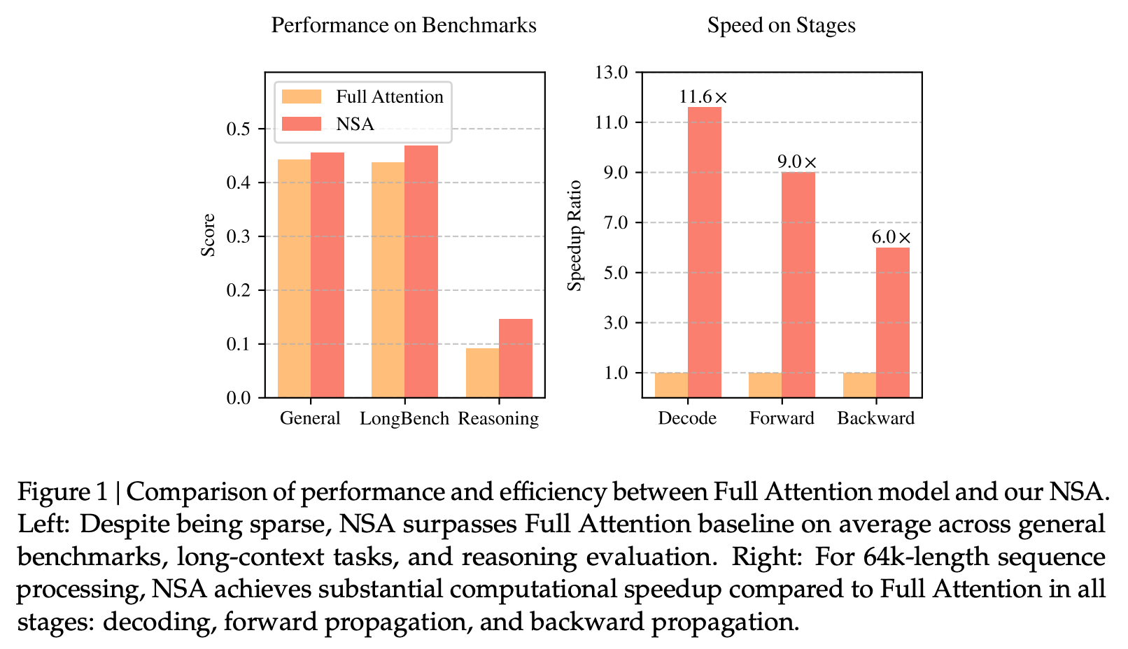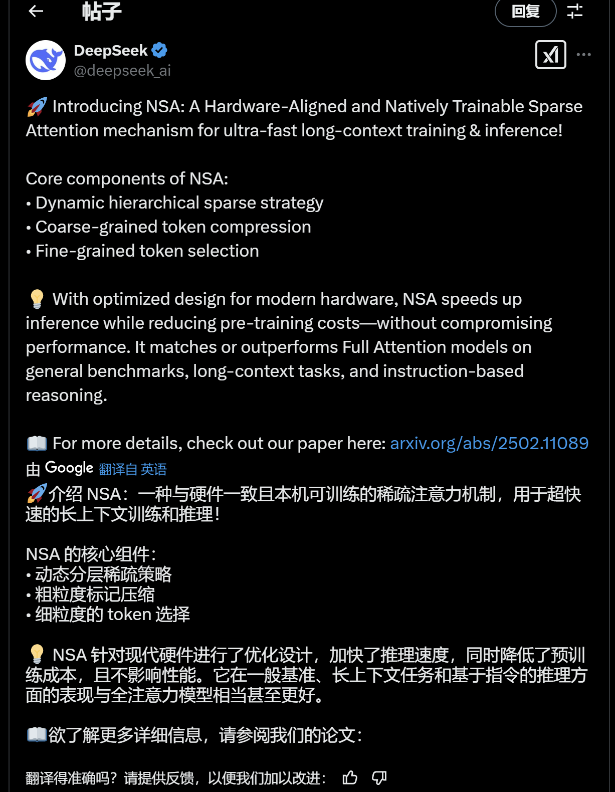 DeepSeek介绍称,NSA专为长文本训练与推理设计,通过动态分层稀疏策略等方法,显著优化了AI模型在训练和推理过程中的表现,特别是提升了长上下文的推理能力,在保证性能的同时提高了推理速度,降低了预训练成本。