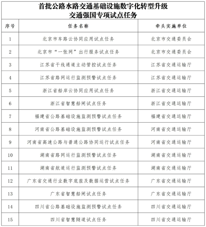 这些试点任务由第一批纳入交通基础设施数字化转型升级政策支持的省份交通运输部门牵头实施,主要聚焦四大方向:一是推动运输服务数字化普惠升级,加强“一路多方”“闸港区船”等信息互通联动,开展跨部门、跨区域协同调度,打造“一张网”伴随式服务。二是提升基础设施安全防护能力,通过部署感知、传输、控制设备,实现多源数据智能融合应用,完善安全防控体系。三是深化交通运输数据要素开发利用,构建标准统一、分层解耦、融合集成的数字底座,探索建立全链条、多元化的交通数据运营体系。四是促进产业协同创新发展,推动5G、大数据、人工智能等新技术与基础设施深度融合,推进车路云、船岸云等产业发展,优化政策创新环境。