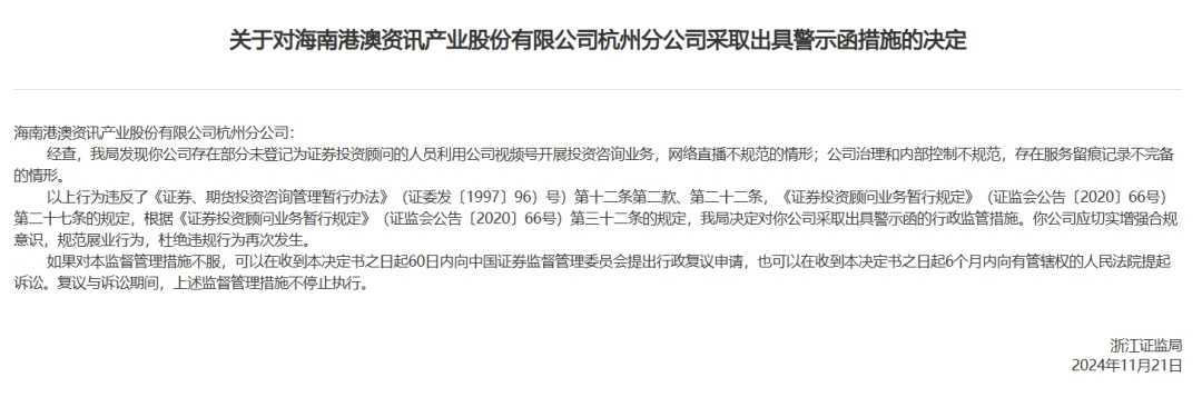 近日,浙江证监局正式发布了针对海南港澳资讯产业股份有限公司杭州分公司的监管决定,对其采取了出具警示函的行政措施。