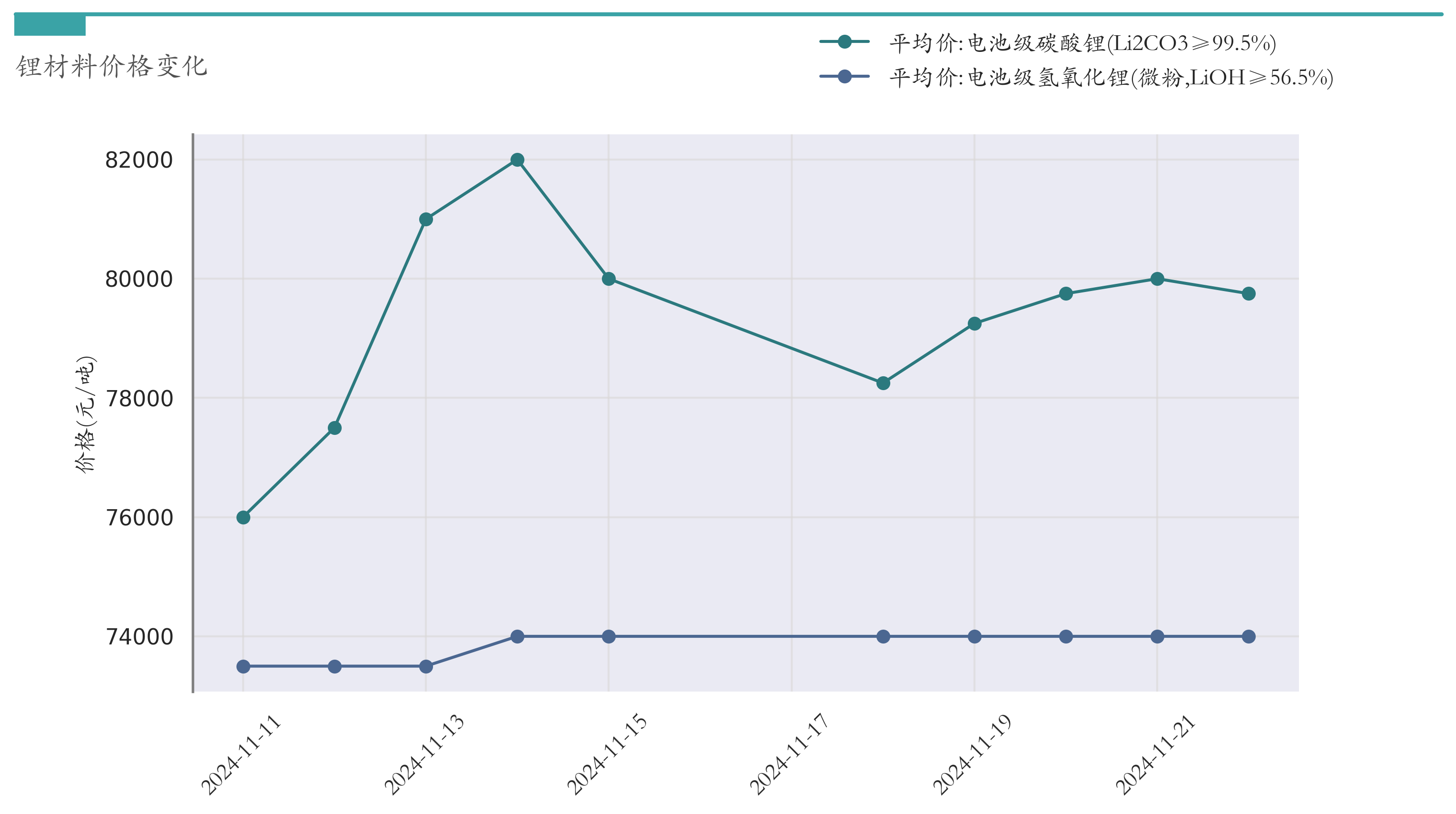 1. 锂:截至11月22日,电池级碳酸锂均价为79750元/吨,较前一周下跌250元/吨;电池级氢氧化锂均价稳定于74000元/吨。