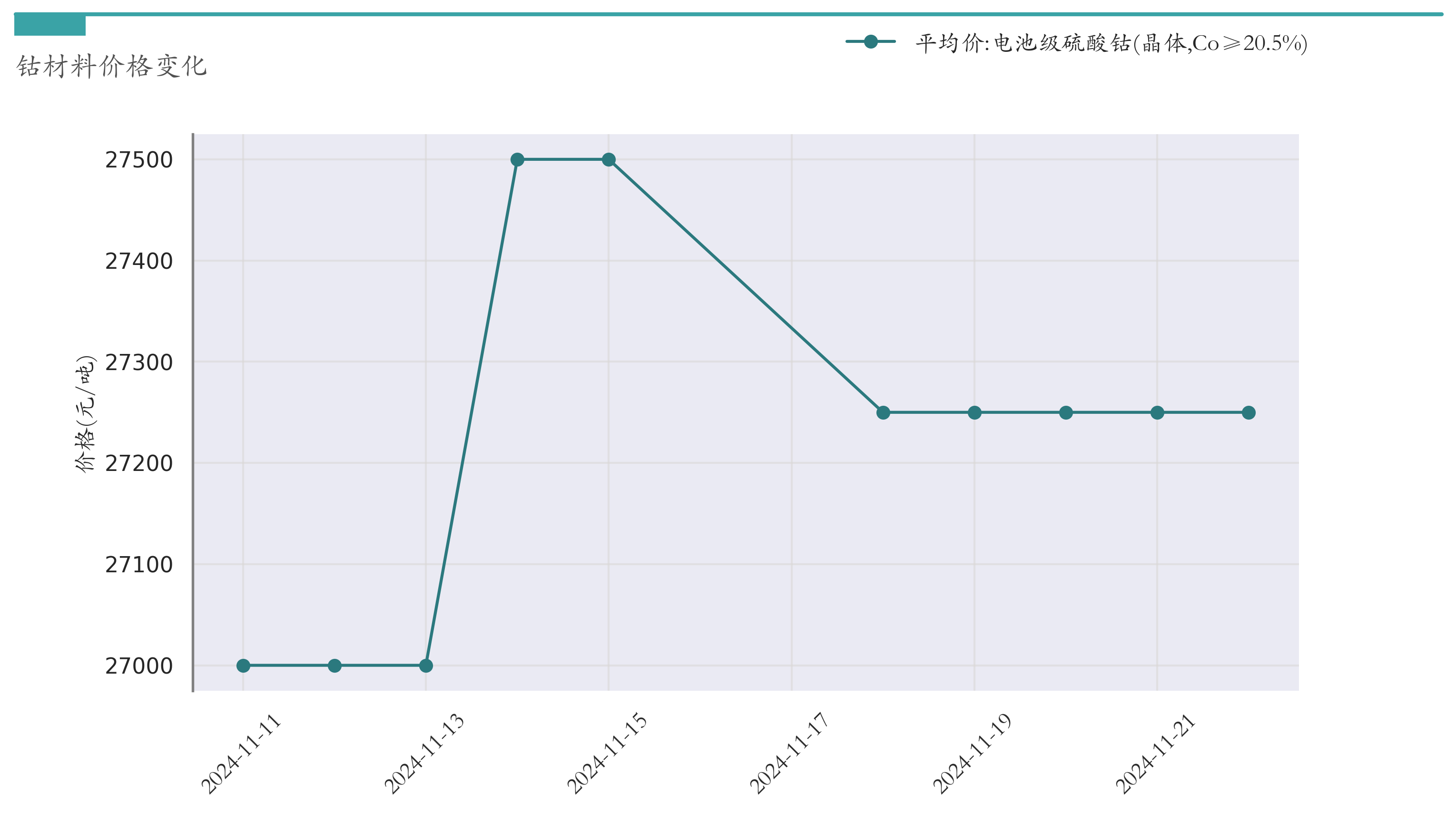 2. 钴:电池级硫酸钴均价为27250元/吨,较前一周下跌250元/吨。