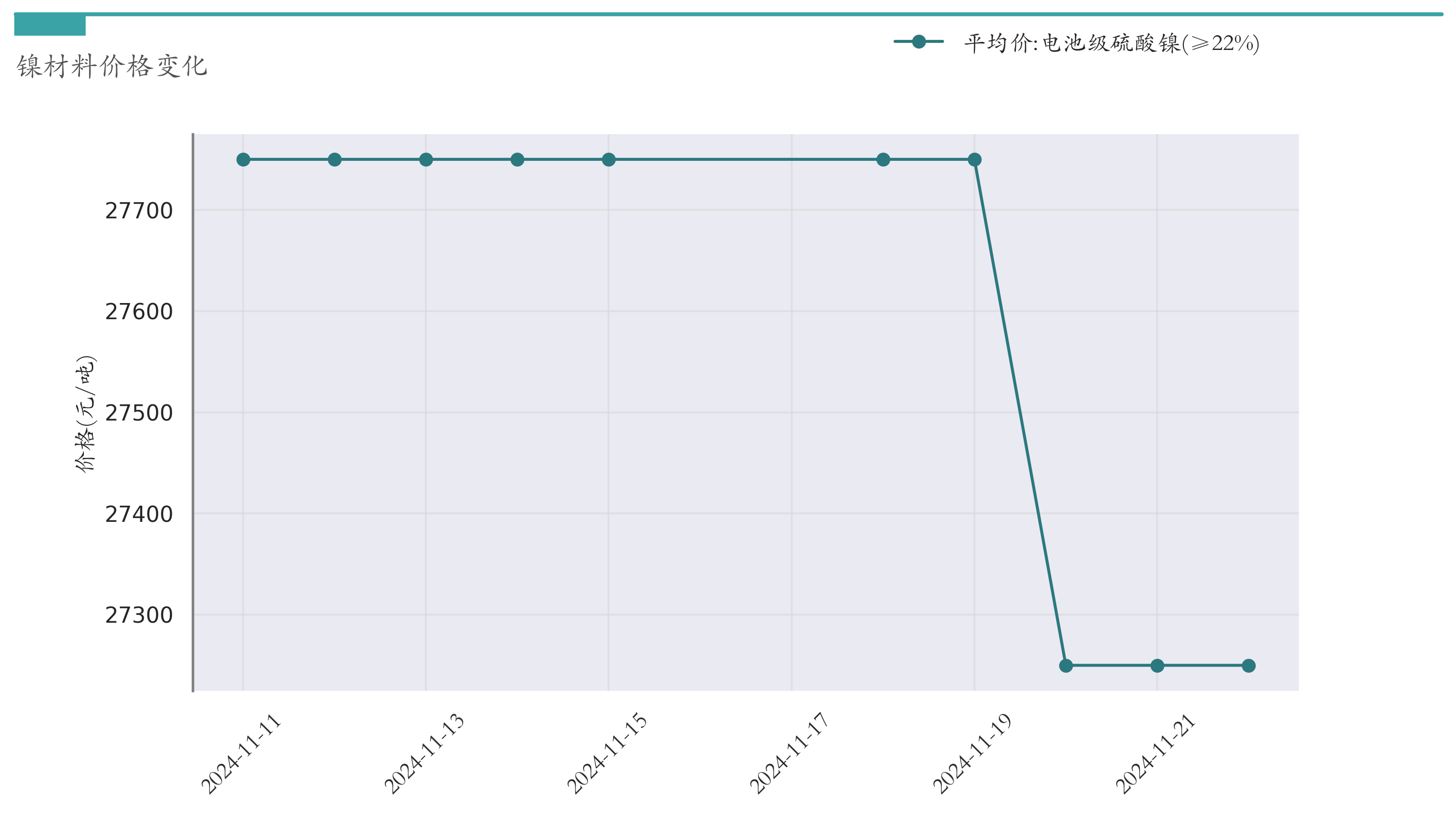 3. 镍:电池级硫酸镍均价为27250元/吨,较前一周下跌500元/吨。