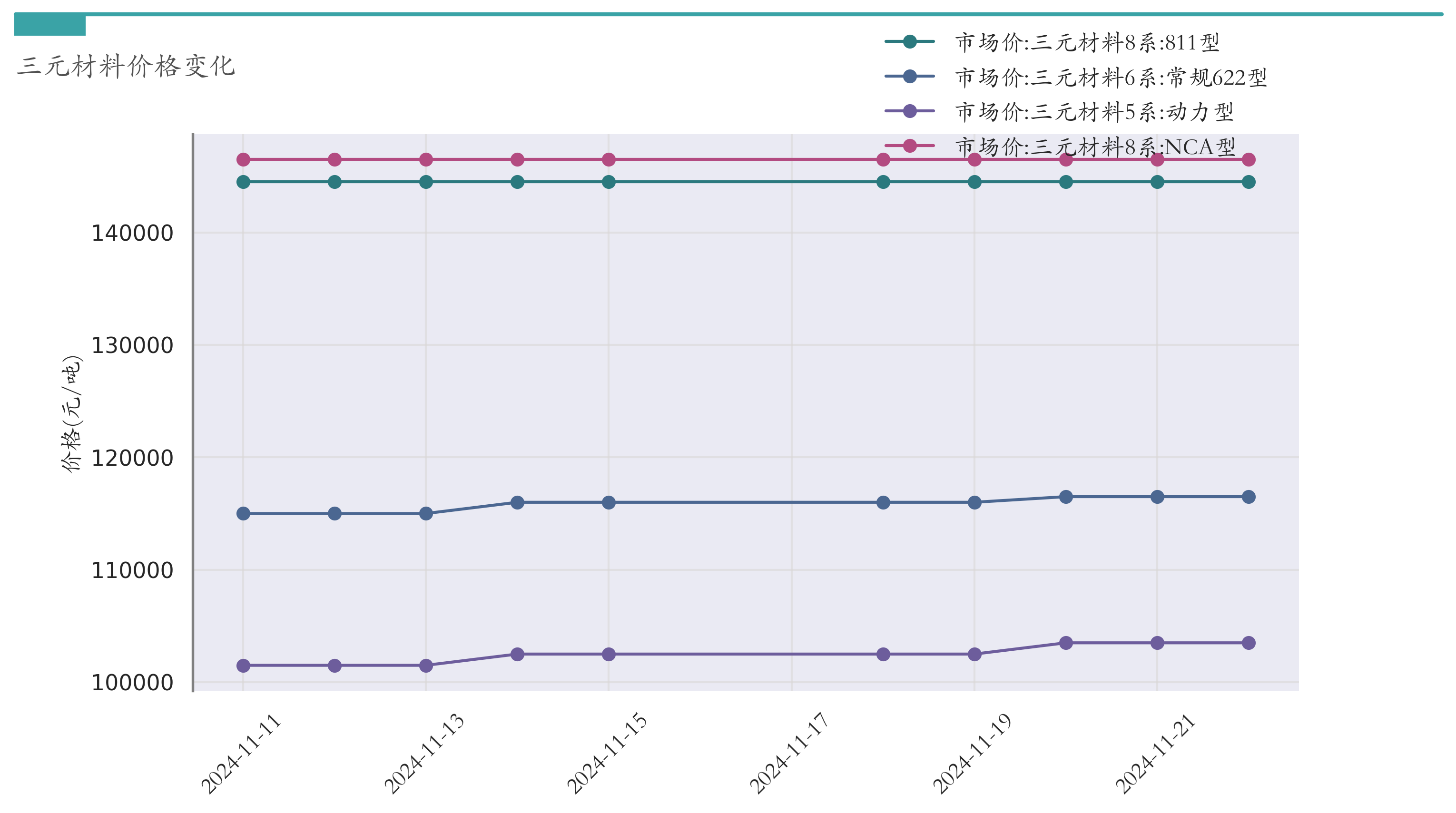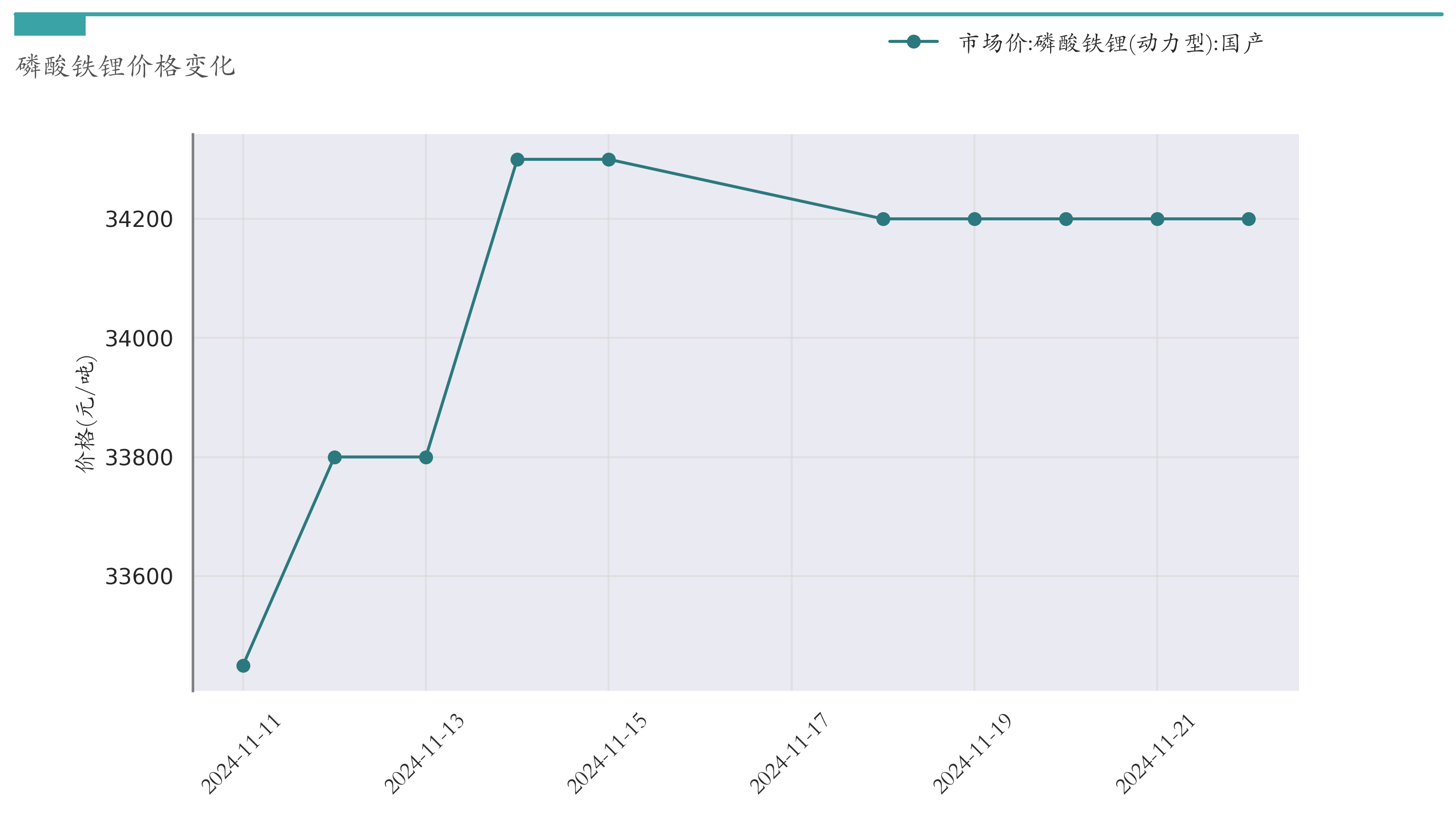 4. 正极材料:磷酸铁锂均价为34200元/吨,较前一周下跌100元/吨;三元前驱体及三元材料价格均有所调整,整体呈现小幅波动。