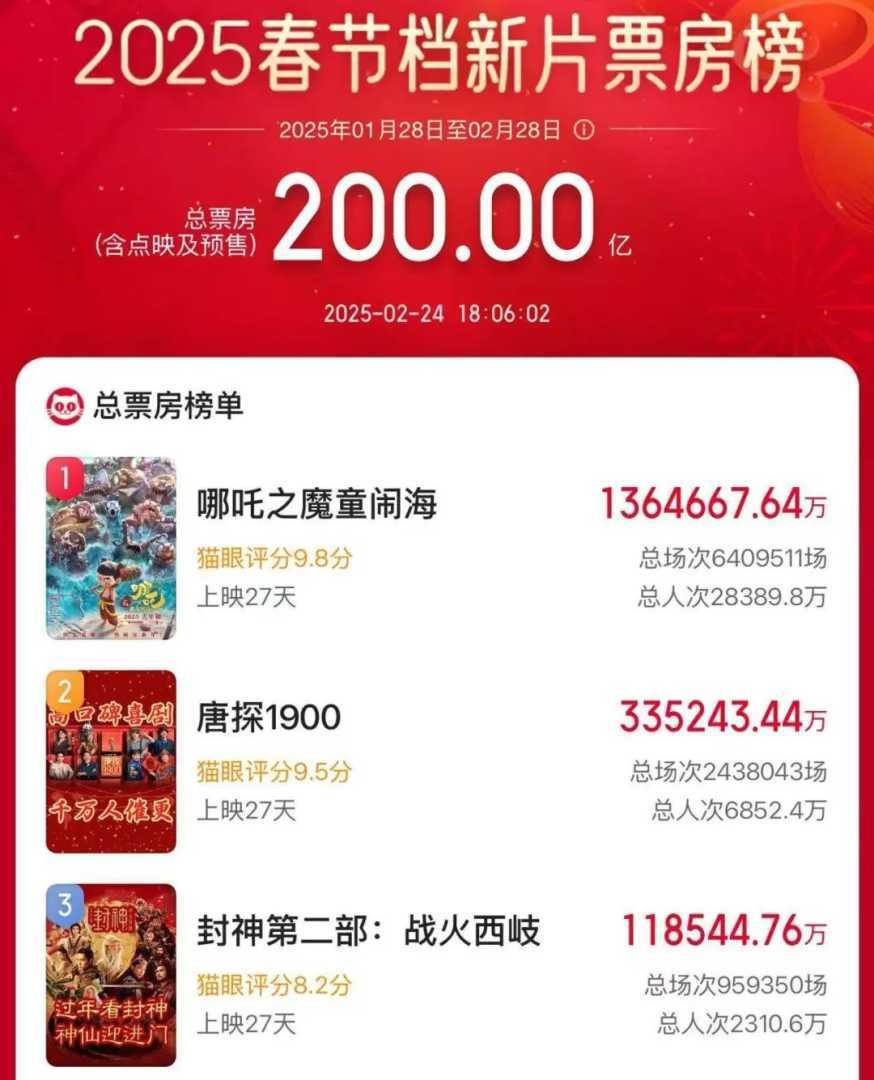 2025春节档票房突破200亿,《哪吒之魔童闹海》领跑
