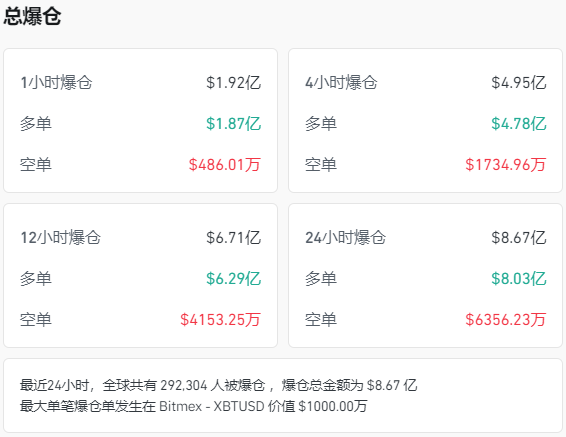 据Coinglass统计,近24小时内,加密货币市场中有超过29.2万人爆仓,爆仓金额高达8.67亿美元(约合人民币63亿元),市场损失惨重。