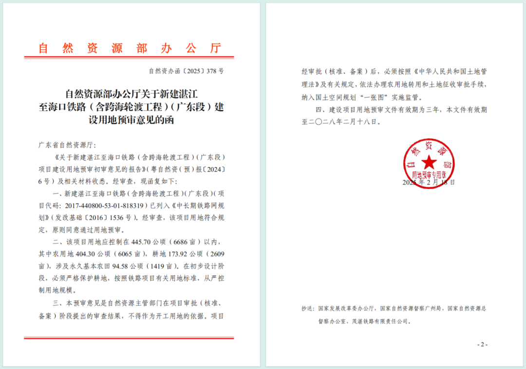 2月26日,据“湛江发布”消息,湛江市自然资源局透露,新建湛江至海口铁路(含跨海轮渡工程)(广东段)建设项目用地预审已获得自然资源部批准,标志着这一重要交通项目进入实质性推进阶段。