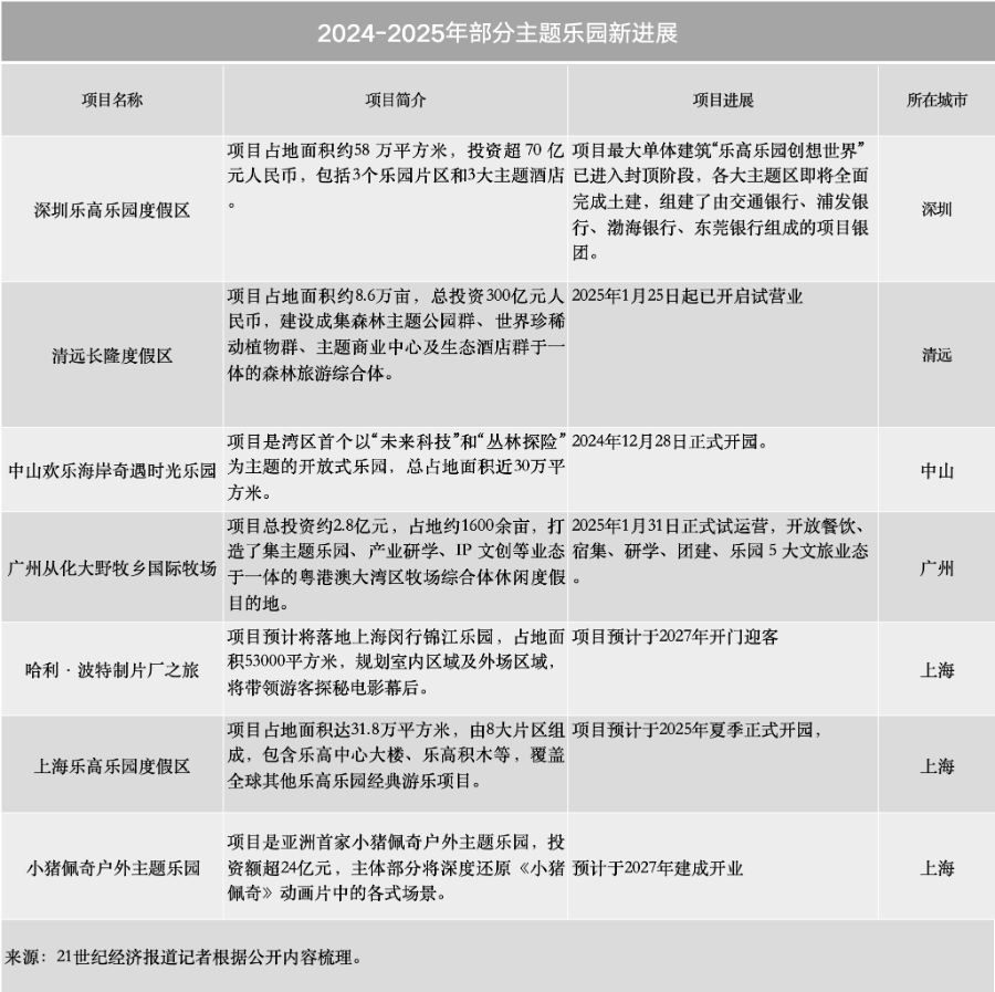 春节期间,粤港澳大湾区传来多家主题乐园新动态,清远长隆乐园、中山欢乐海岸、大野牧多国际牧场相继开业;深圳乐高乐园的最大单体建筑已进入封顶阶段。同时,上海也加速引进哈利波特的魔法世界、乐高乐园等国际IP乐园。