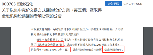 值得注意的是,银行向央行申请再贷款的年利率为1.75%,这意味着农业银行以“零利差”方式向恒逸石化提供贷款,全力支持其股份回购计划。